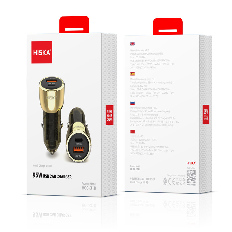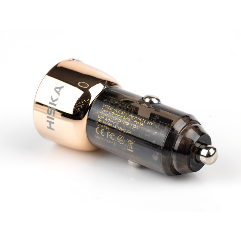 شارژر فندکی هیسکا مدل HCC-318 از جنس آلیاژ روی و پلاستیک PC ساخته شده که دوام و مقاومتی عالی دارد. این محصول با ابعادی کوچک (63×29 میلیمتر) طراحی شده است و به راحتی در فضای کم داخل خودرو جای میگیرد. این شارژر با ورودی برق 12 تا 24 ولت DC کار میکند، که آن را با انواع خودروها سازگار میسازد. شارژر فندکی هیسکا مدل HCC-318 دارای دو نوع پورت خروجی است: پورت USB-A که تا توان 30 وات خروجی دارد و میتواند دستگاههای مختلف را با ولتاژهای 5V، 9V و 12V شارژ کند. پورت Type-C با توان خروجی حداکثر 65 وات که میتواند به صورت سریع دستگاههای شما را در ولتاژهای 5V، 9V، 12V، 15V و 20V شارژ کند. این پورت به ویژه برای دستگاههای دارای فناوری شارژ سریع (Fast Charging) مناسب است و میتواند به راحتی لپتاپها، تبلتها و گوشیهای هوشمند را شارژ نماید. این شارژر فندکی با توانایی تأمین شارژ سریع و پایدار، یک گزینهی ایدهآل برای مسافرتها و استفادههای روزمره است.